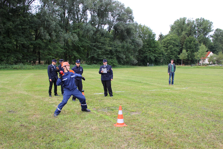 Wir trafen uns am Freitag den 29.07. pünktlich um halb sechs am Feuerwehrgerätehaus. Dort zogen wir uns unsere Schutzanzüge an, trafen letzte Vorbereitungen und übten zur Sicherheit nochmal unsere Knoten für die Prüfung. Pünktlich um sechs Uhr trat dann die erste Gruppe, bestehend aus 9 Personen, zum Leistungsabzeichen an. Die Prüfung beinhaltete einen kompletten Nassaufbau, das legen einer Saugleitung,und ein vom Trupp abhängiger Knoten. Nachdem jeder seinen Knoten gemacht und die Gruppe sowohl den Nassaufbau als auch die Saugleitung auf Zeit vor den Prüfern abgelegt hatte, gingen die Wertungsrichter zu einer kleinen Besprechung ins Feuerwehrhaus. Als sie zurückkehrten bekam jeder eine Auszeichnung und einen herzlichen warmen Händedruck zum bestandenen Leistungsabzeichen.